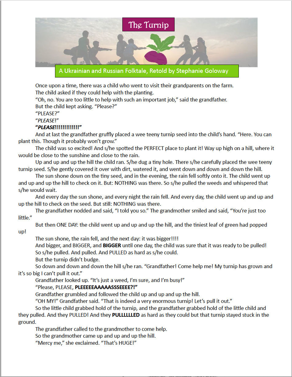 Dazzling Downloads! World Nursery Rhyme Week 2024 Activity Downloads Food Rhymes for Resilience Poster Download Food Rhymes Poster! Here We Go ‘Round the Old Woman’s House Movement Song Download the Song! Vivian Gussin Paley’s Storytelling/Storyacting Process: Resilience Magic! Download the Process! Rhythms of Resilience: Ways that Rhythm Play Offers Resilience-Nurturing Experiences Download Rhythms of Resilience! The Magic Beans of Resilience:Protective Factors Poster Download Protective Factors! “Three Billy Goats Gruff” Group Mural Executive FUNction Magic! Download the Mural How To! Process Art: Creating Collage Papers Creating Collage Papers pdf “The Three Billy Goats Gruff for Storytelling/Storyacting” Relationship Magic! Download the Story! Get Inspired to Retell The Six Swans! Just Print, Cut, and Use! Link to Six Swan Characters pdf Elvin Executive Functions: Musical Shoes Download Musical Shoes Sample Gold Loose Parts List for Families! Download Gold Loose Part Letter! Spinning to Resilience: Rotation Schema Download Spinning to Resilience The Turnip, A Ukrainian/Russian Folktale To Retell! Download The Turnip, A Retelling Watercolors, Step-by-Step: Colorful Executive Functions! Download Watercolor Process! Swimming in Place Movement Challenge for “Mervelous” Working Memory Download Movement Challenge! Loose Parts: Sand and WaterItems to Inspire Magical Mer Initiative in Play! Download Loose Parts for Mer Play! Mer Magic in the Story Center!(Mermaid-ish materials to engage and spark young story makers & writers) Download Story Center Mer Magic! Download “Arcia Had a Little Lamb” Verses for Rhyming Regulation Magic! Download the Rhyme!